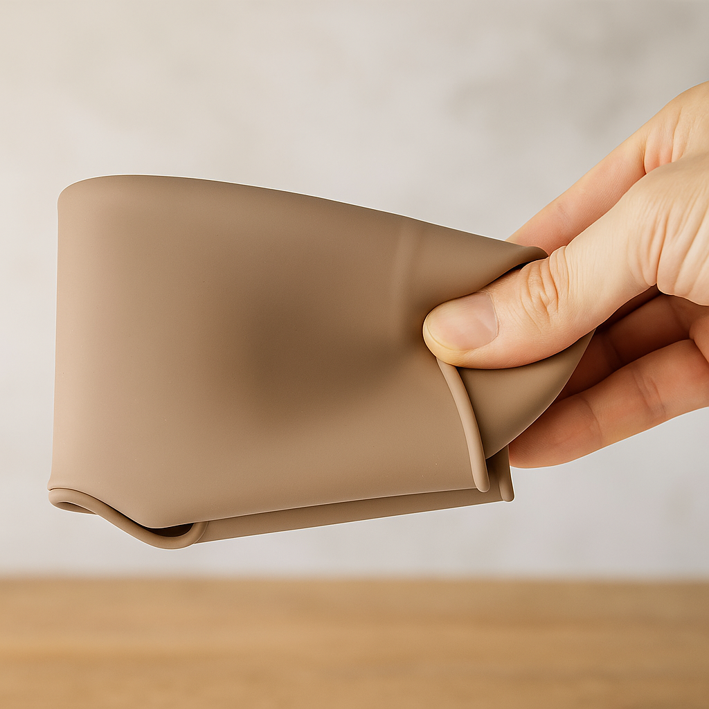 The bib is made of soft, flexible silicone. The structure moves with the child rather than folding or crinkling in stiff ways. This helps prevent folding inward while in use.