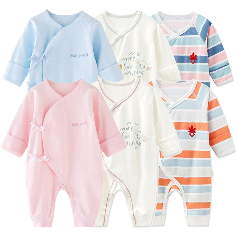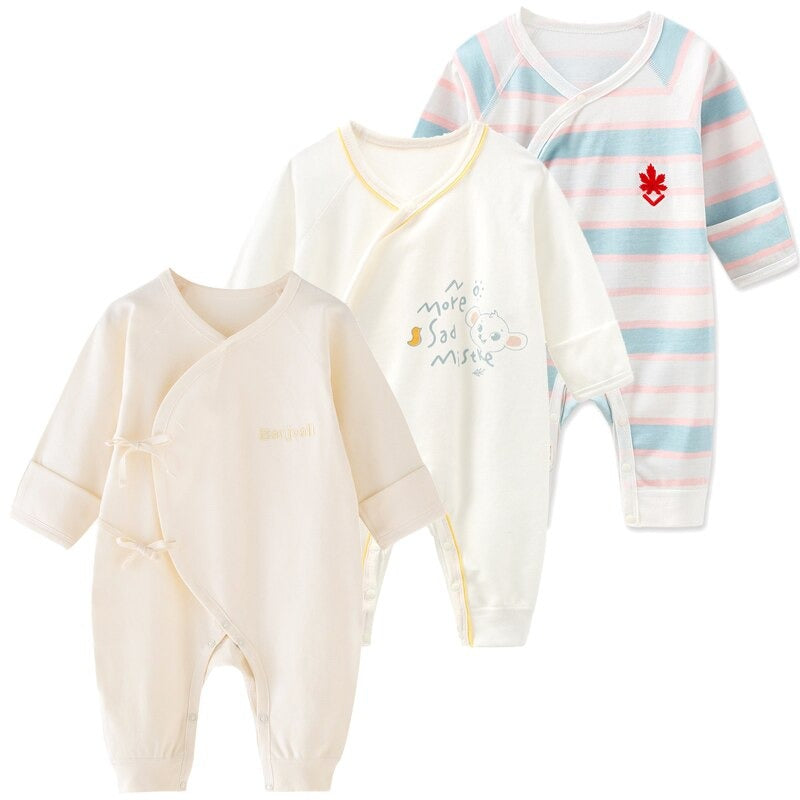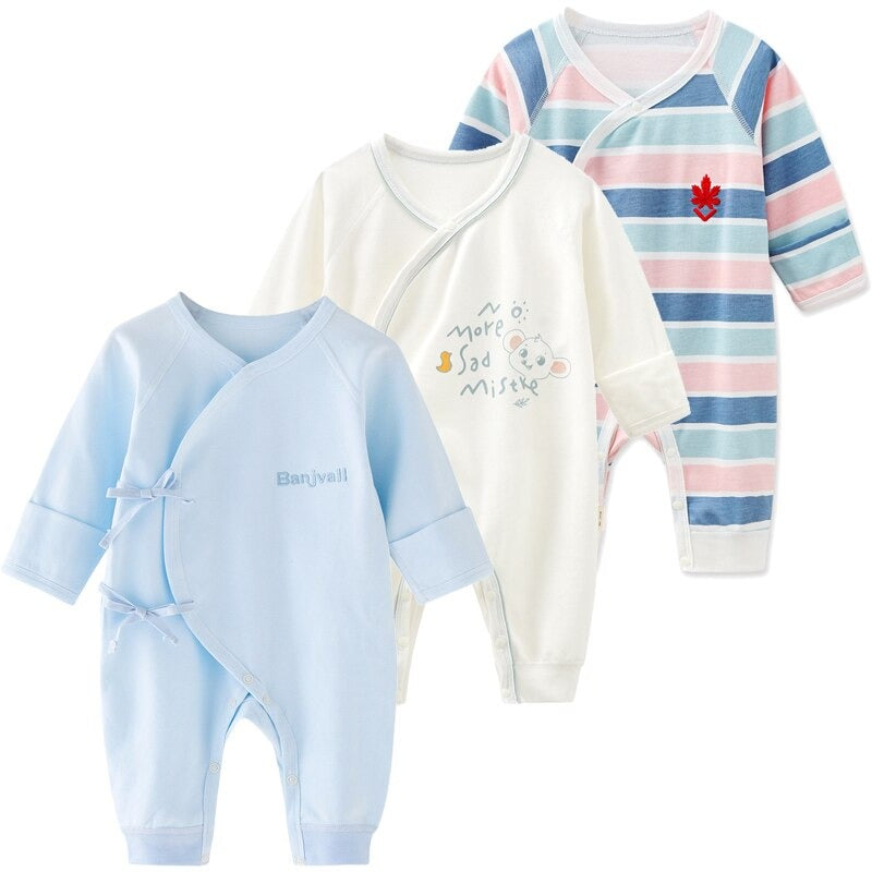 This 3Pcs Long Sleeve Romper Pajama Set is perfect for your little one. Made with soft cotton material, it is suitable for both the spring and autumn seasons. The set includes a belt closure for easy dressing and a v-neck collar for added comfort. The fun print pattern is sure to delight your baby, while the full sleeve length and regular sleeve style provide warmth and coverage.�