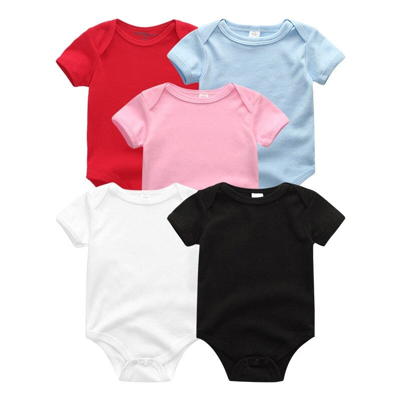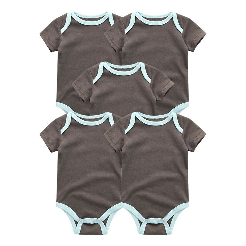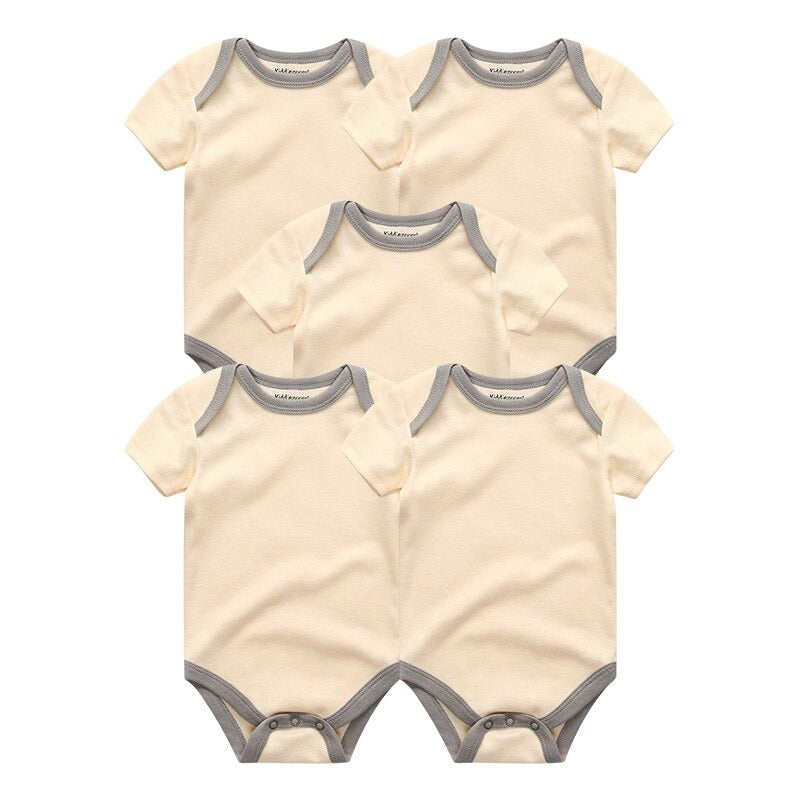 Your�little one will look and feel great in our 5 Pcs Unisex Cotton Short Sleeved Bodysuits For Newborns. Made of 100% pure cotton, this set is ideal for hot weather. The solid color design and O-neck collar make it unisex. The snap closure allows for easy dressing and the short sleeves give your little one freedom of movement.