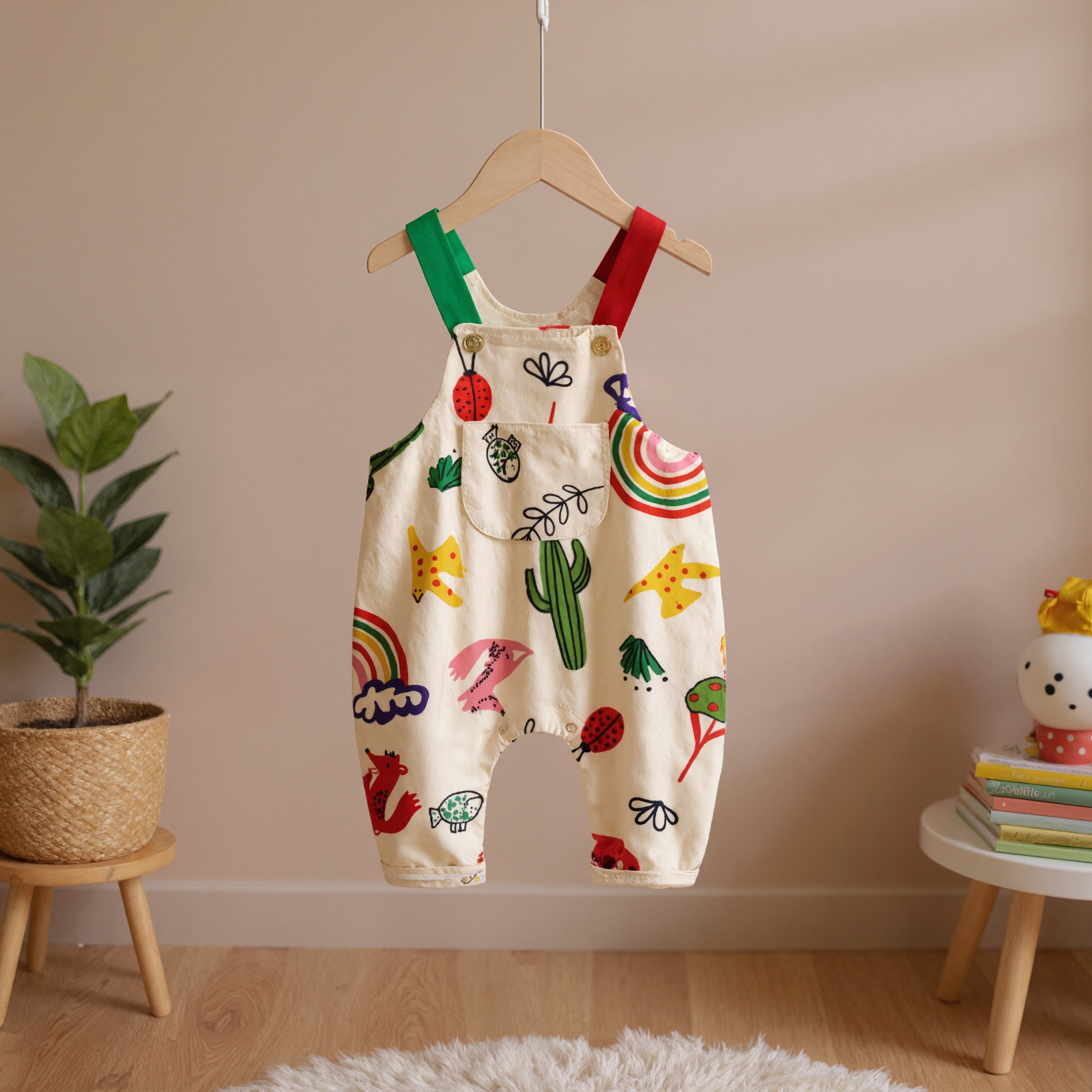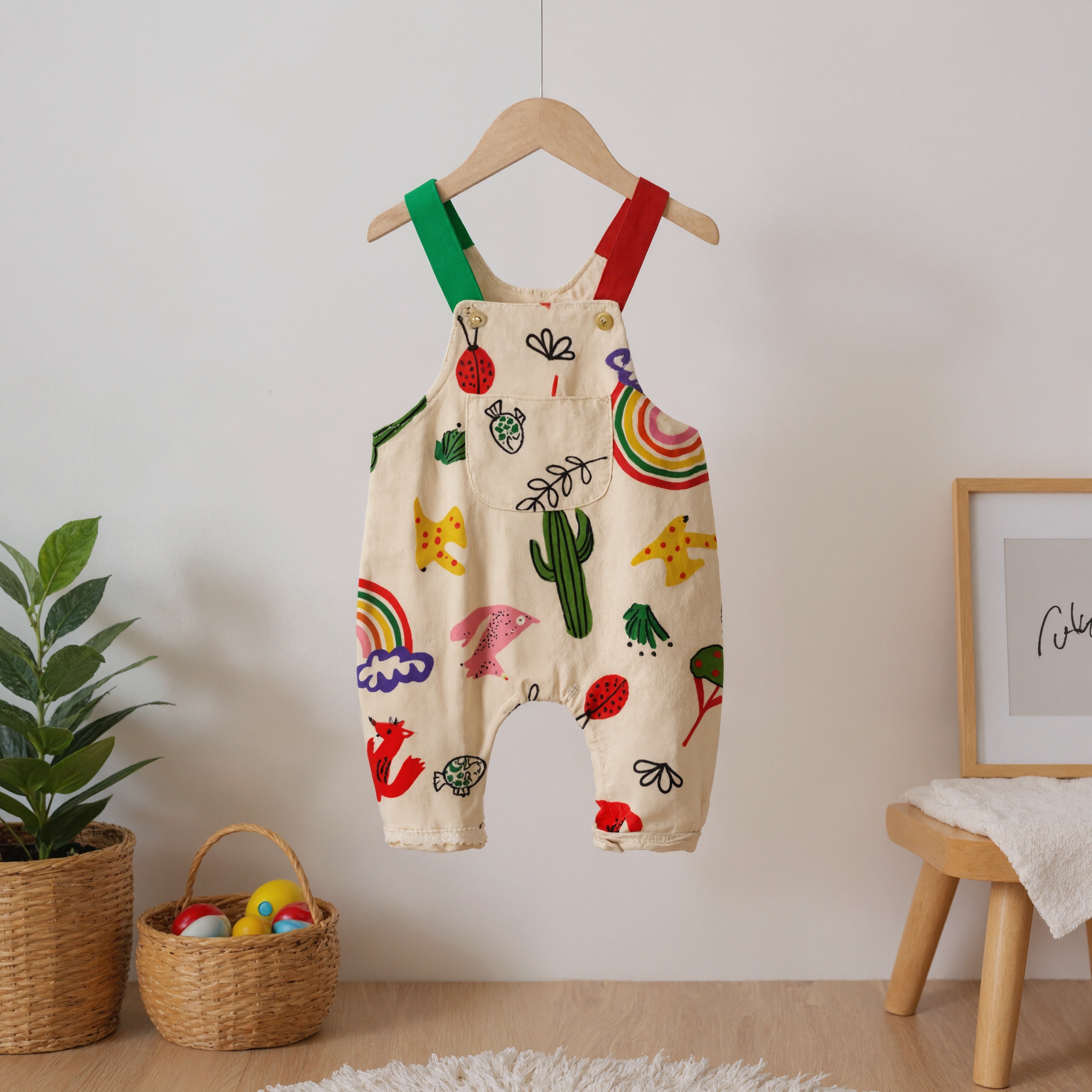 Bring colors to your child��s wardrobe with the stylish Toddler Multicolor Outfit. This piece is designed to combine practicality and cheerful design in one easy-to-wear overall. Featuring a beige base with multicolor prints of animals, rainbows, and nature details, it adds personality to any day.