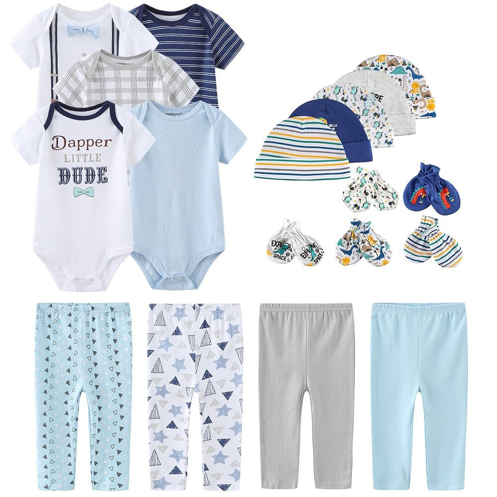 Welcome your little bundle of joy in style with the Kiddiezoom Newborn Baby Clothes Sets! This set is designed with your baby's comfort in mind. Crafted from the finest materials, this set includes a long-sleeve bodysuit, pants, and a cozy hat. The bodysuit is made from soft, breathable cotton and features a snap closure for easy dressing. The pants have an elastic waistband that provides a perfect fit and extra comfort. The included hat is made from a lightweight and breathable cotton blend and ties around the chin for a secure fit. The sets come in a variety of colors and patterns so you can find the perfect look for your little one!