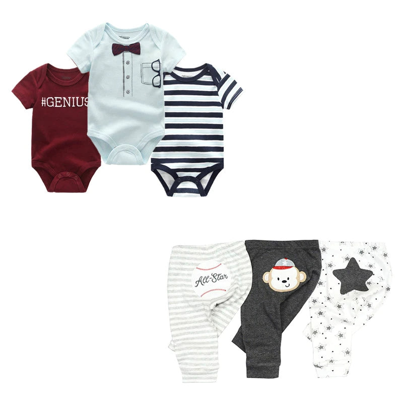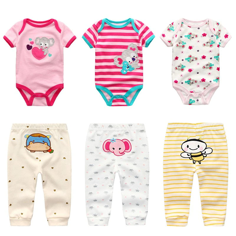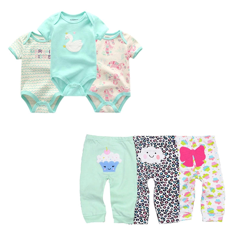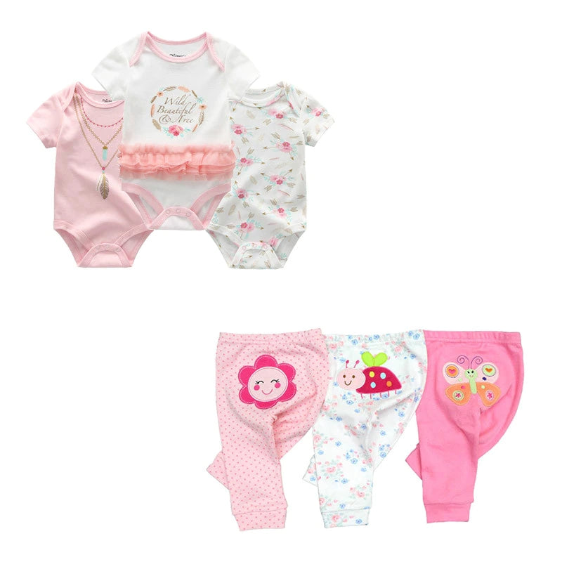 Get summer vibes going with this playful and unique body suit that is great for playing, sleeping, or strolling in the park. The Newborn Baby 6 Piece Bodysuit & Pant Set comes in an adorable top made from a soft cotton fabric that��s comfortable and easy to wear. The shapely cut and knee-long length are so flattering on any little angel.
