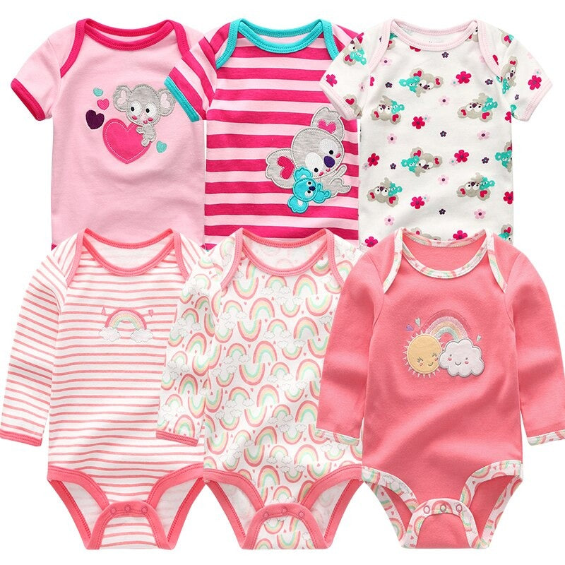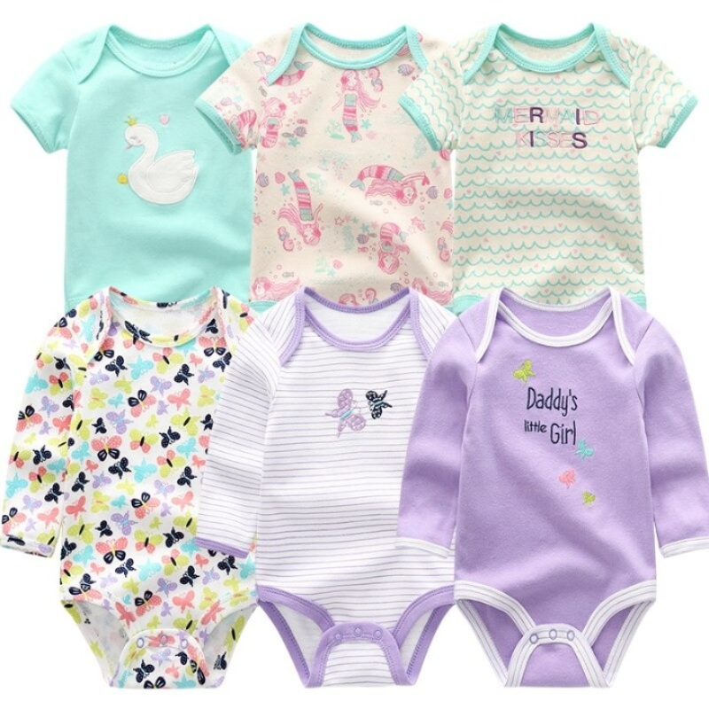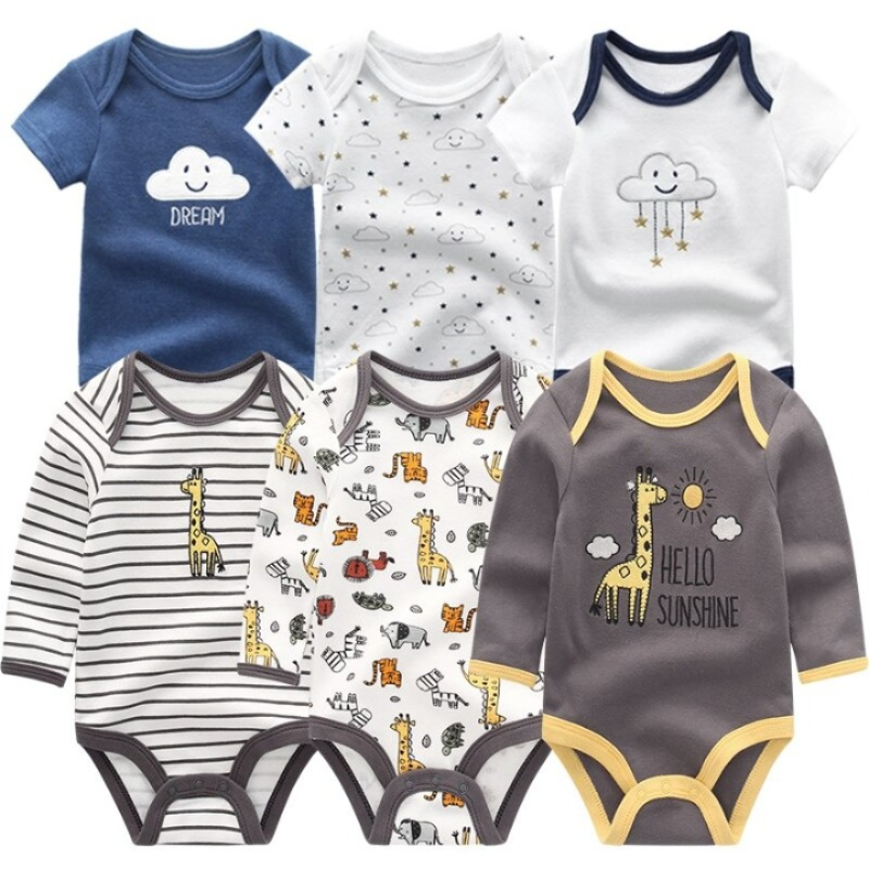 These�Newborn Baby Rompers Jumpsuit 6Pcs Set are not only incredibly fashionable but also incredibly comfy. Premium cotton is used in the creation of this jumpsuit. The o-neck collar of this bodysuit makes it more demanding and attractive while also being well-suited for the spring and autumn seasons. Choose your favorite style from the range of options available for these bodysuits.